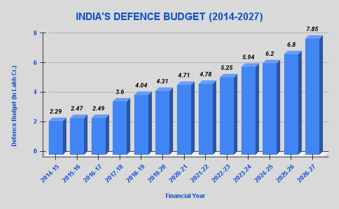 The Ministry of Defence has been allocated Rs 7.85 lakh crore for FY 2026–27, about 15% higher than last year’s Budget Estimate of Rs 6.81 lakh crore. At roughly 14.67% of total central government expenditure, defence remains the single largest budget head among all ministries.