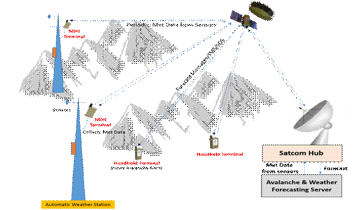 Forecasting Server utilizes meteorological data collected from NATSAT-M terminals along with other historical data as input to generate avalanche and weather forecasts. These forecasts are sent to the SATCOM hub on an over-leased line link.